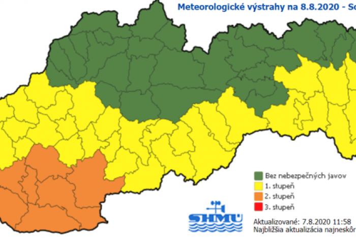Na sobotu (8. 8.) vydal výstrahy prvého a druhého stupňa. Platia pre väčšinu Slovenska, a to od 12.00 do 17.00 h. Horúčavy by mali pokračovať aj v nedeľu (9. 8.).