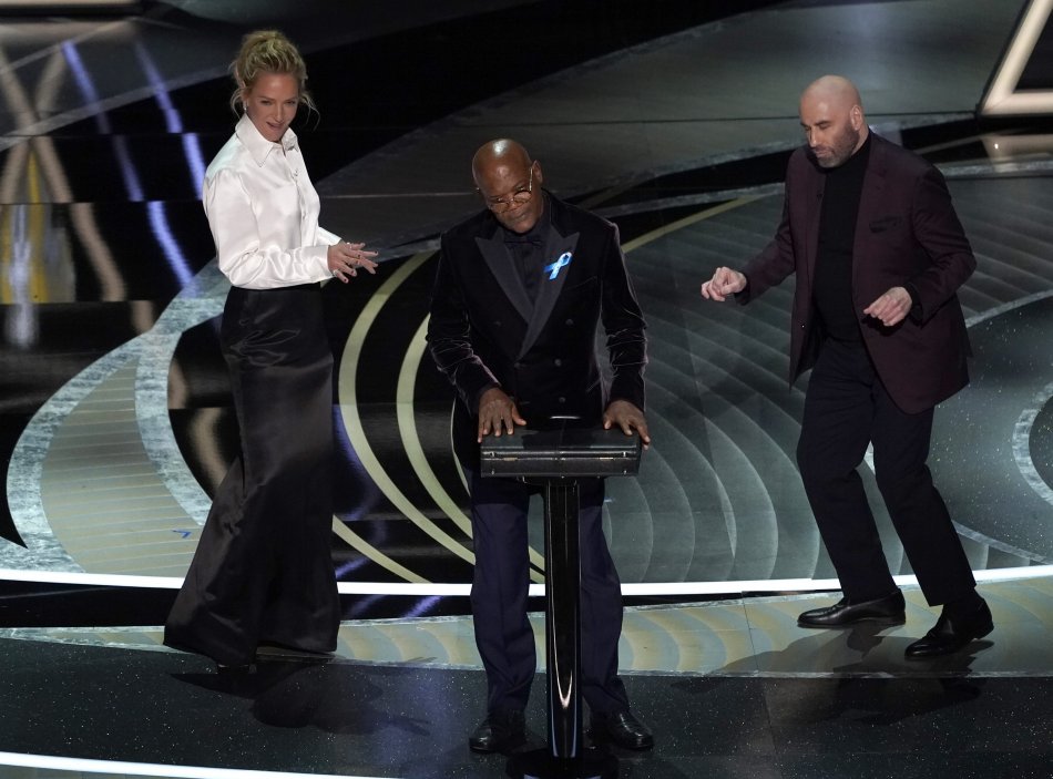 Zľava Uma Thurmanová, Samuel L. Jackson a John Travolta