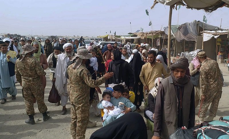 Pakistanskí vojaci kontrolujú dokumenty cestujúcim do Afganistanu na hraničnom priechode v pakistanskom Čamane 16. augusta 2021.