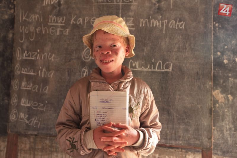 rinásťročné albínske dievča Mina Godfreyová pózuje pred tabuľou v škole 24. mája 2016 v meste Machinge