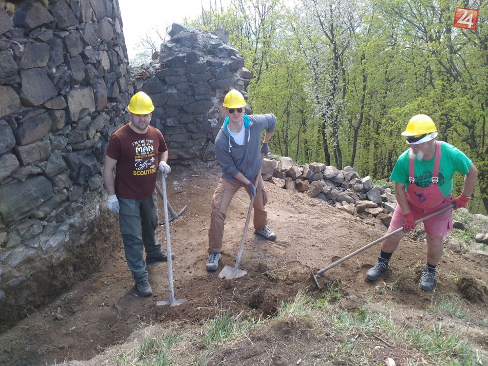 Práce na Hrade Šariš pri obnove bašty Alžbetka.