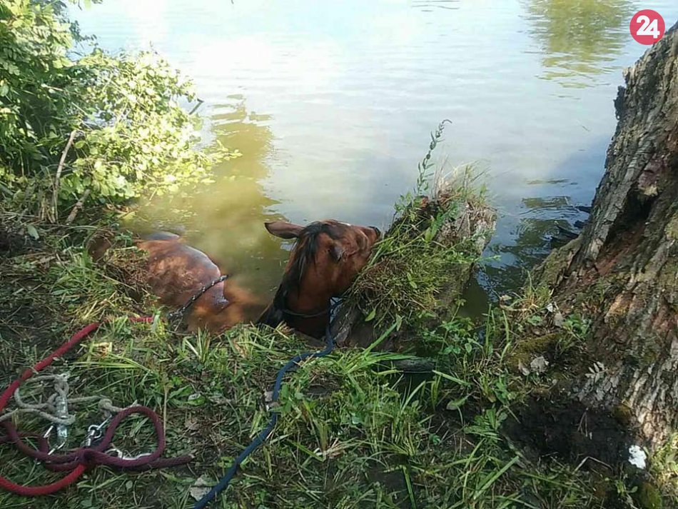Galéria k článku Hasiči asistovali pri záchrane koňa: Pomocou lana ho vytiahli na breh, FOTO