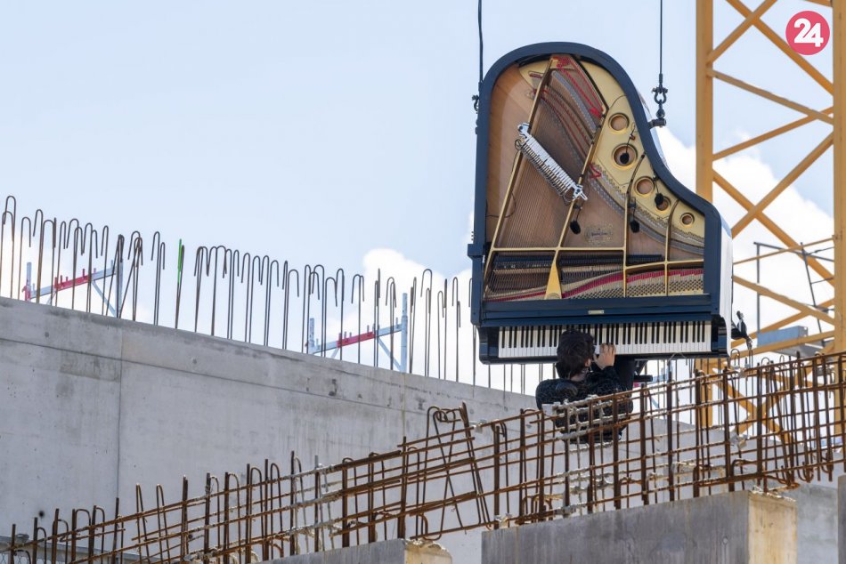 Galéria Hudobník hral na klavíri zavesenom na žeriave