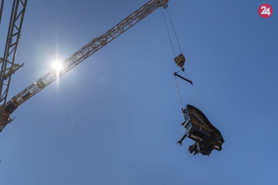 Galéria Hudobník hral na klavíri zavesenom na žeriave