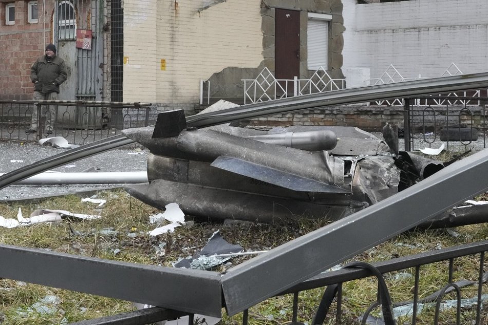 Muž si prezerá materiálne škody po ostreľovaní ruskou armádou v Kyjeve.