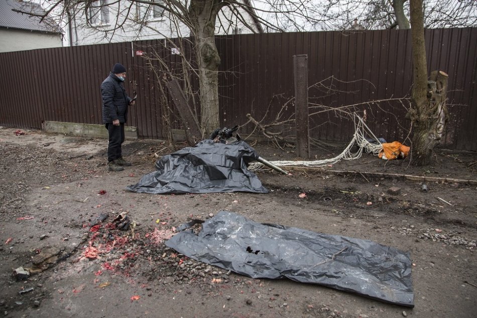 telesné pozostatky obetí, ktoré sú prikryté čiernymi vrecami neďaleko vraku zostreleného lietadla v Kyjeve