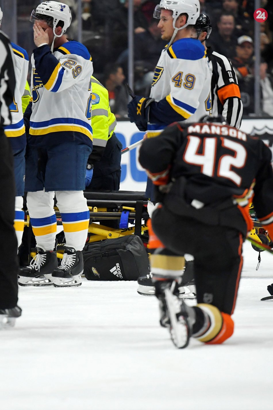 Počas zápasu NHL medzi St. Louis a Anaheimom po kolapse obrancu Bouwmeestera tuhla krv v žilách.