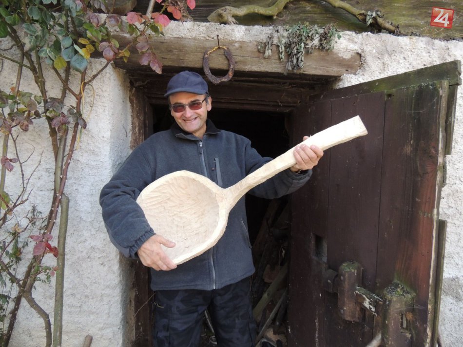 Alojz Patsch pózuje s drevenou vyrezávanou maxi lyžicou.