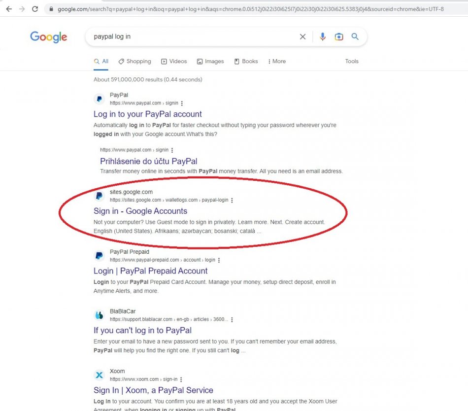 Do vyhľadávača zadáte paypal log in a všimnite si v poradí tretí výsledok. Adresa obsahujúca sites.google nevyzerá podozrivo a ľahko sa môže stať, že na ňu kliknete.