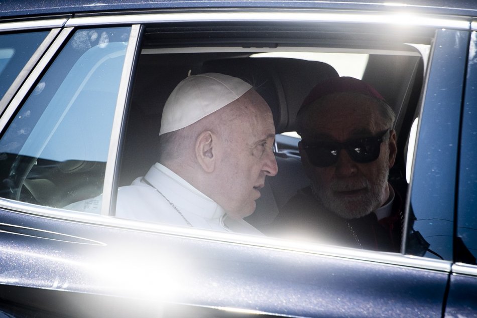 pápež František odchádza v aute zo stretnutia s biskupmi, kňazmi, zasvätenými osobami, seminaristami a katechétmi v Katedrále s. Martina