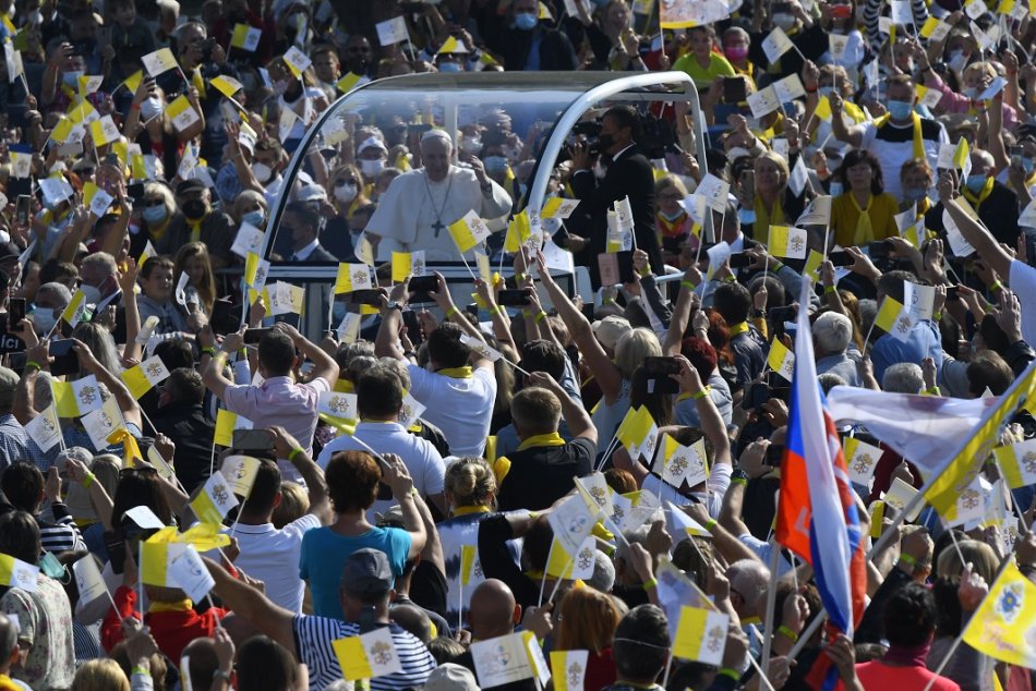 Galéria k článku Svätý Otec žehnal Prešovčanom z ikonického papamobilu. Prevetrá ho aj v Košiciach, VIDEO