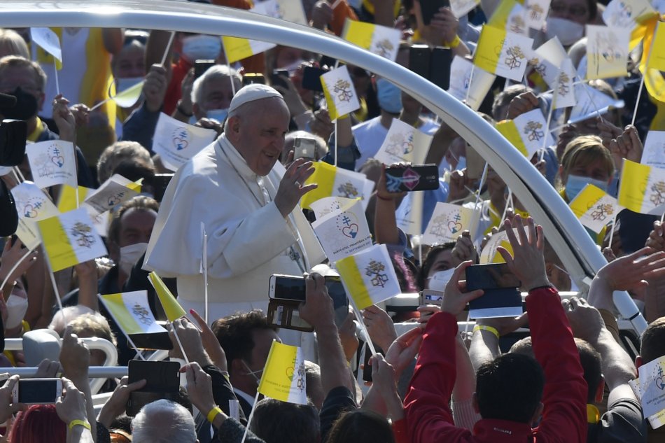 Galéria k článku Svätý Otec žehnal Prešovčanom z ikonického papamobilu. Prevetrá ho aj v Košiciach, VIDEO
