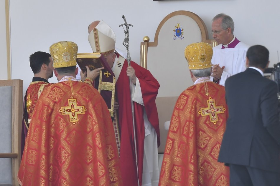 Galéria k článku Svätý Otec žehnal Prešovčanom z ikonického papamobilu. Prevetrá ho aj v Košiciach, VIDEO
