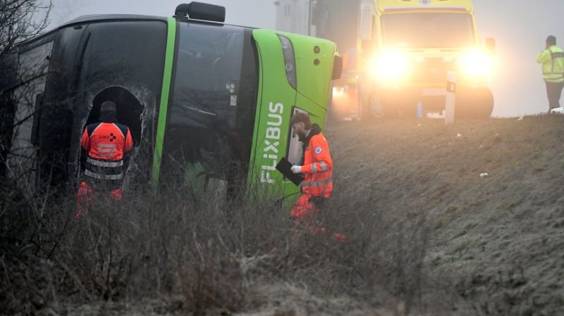 Galéria k článku FOTO z HROZIVEJ nehody prevráteného autobusu: Deväť zranených vrátané detí, úsek je neprejazdný