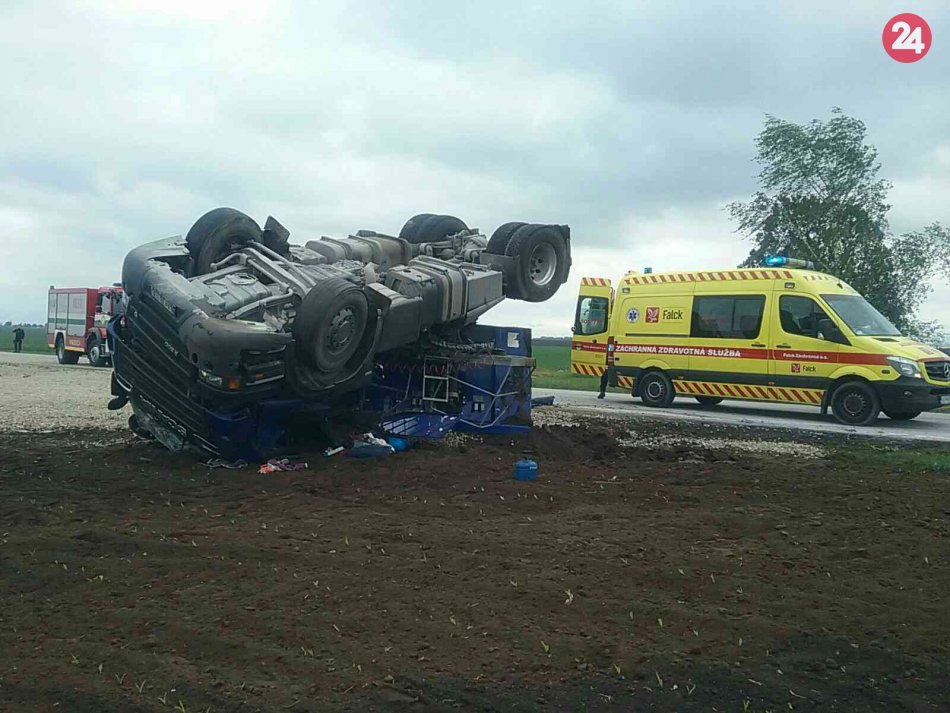 Galéria k článku Nehoda pri Trnave: Kamión so štrkom sa prevrátil mimo cesty, FOTO