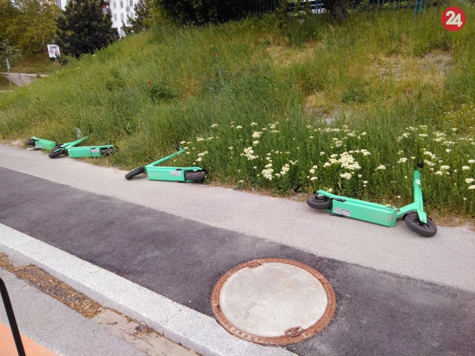 Galéria k článku Pohodené na chodníkoch či zdemolované: TAKTO ktosi zaparkoval zelenú kolobežku v Bratislave!