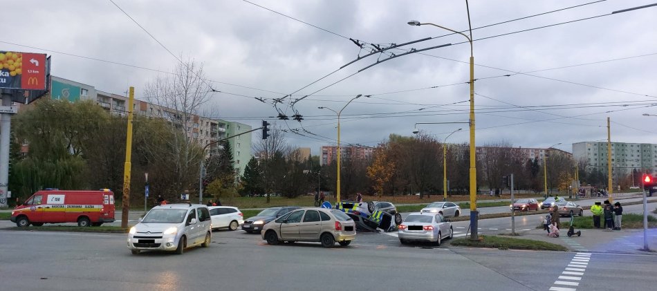 Galéria k článku V Prešove došlo k HROZIVEJ nehode: Policajné auto po nej skončilo na streche, FOTO