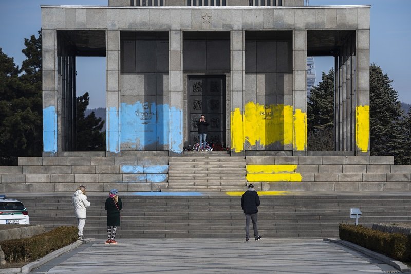 Galéria k článku Pamätník Slavín natreli žltou a modrou farbou, polícia to vyšetruje