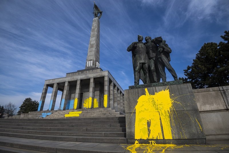 Galéria k článku Pamätník Slavín natreli žltou a modrou farbou, polícia to vyšetruje