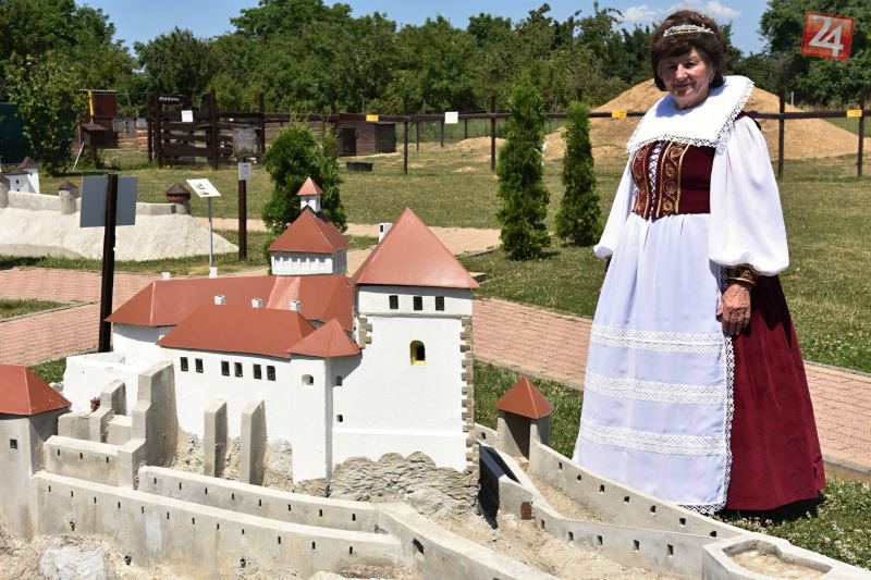 Helena Šimová v kostýme Alžbety Bátoriovej pri zmenšenine Čachticekého hradu