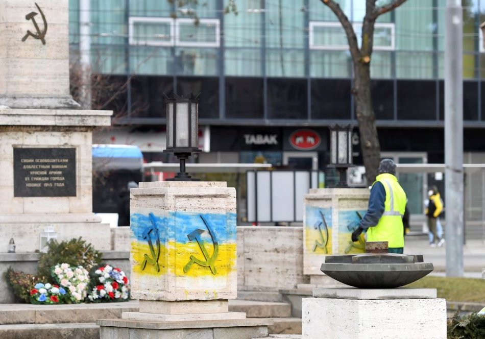 Galéria k článku FOTO: Pamätník sovietskej armády terčom vandalizmu. Pomaľovali ho na modro-žlto