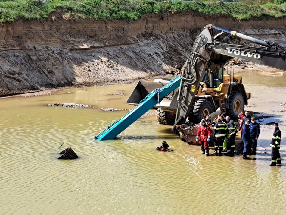 Galéria k článku Bager sa prevrátil a POTOPIL pod hladinu: V kabíne zostal ZAKLIESNENÝ človek!