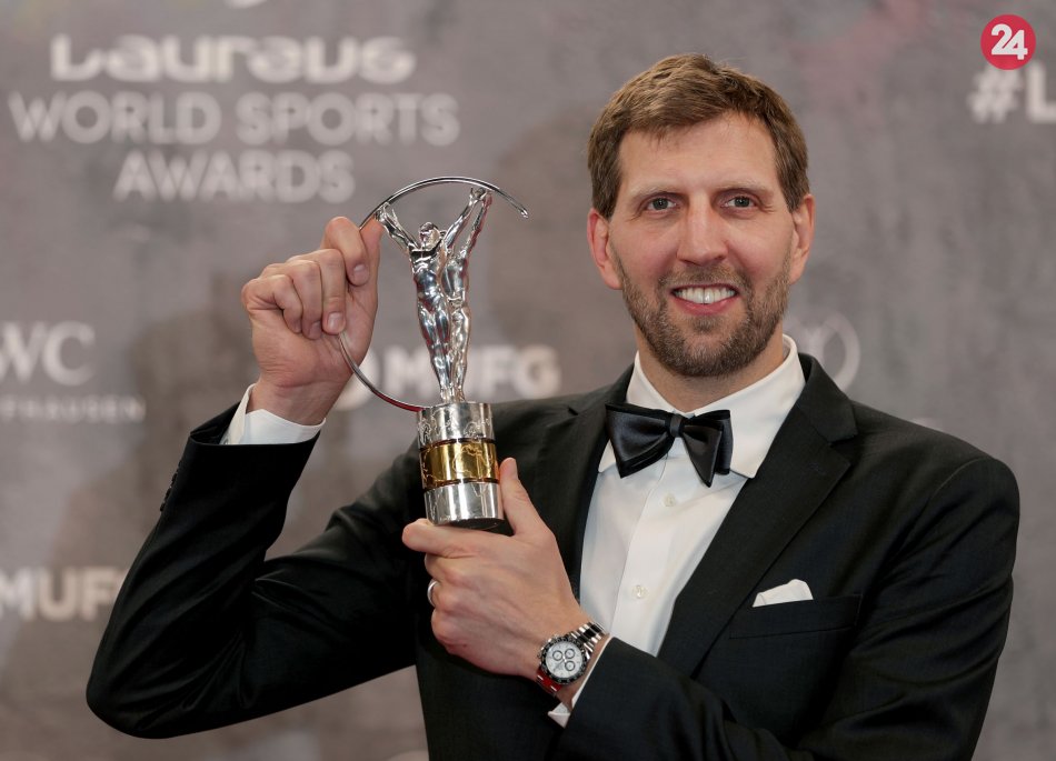 - Na snímke nemecký basketbalista a bývalý hráč zámorského klubu NBA Dallas Mavericks Dirk Nowitzki pózuje s Cenou za celoživotný prínos.