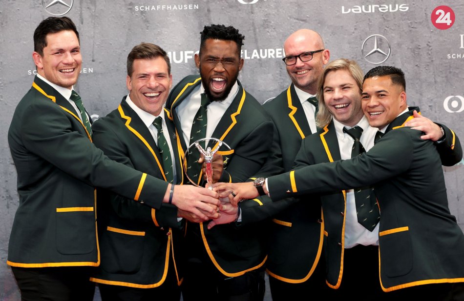 Na snímke hráči juhoafrického reprezentačného ragbyového mužstva a úradujúci majstri sveta pózujú s cenou Tím roka.