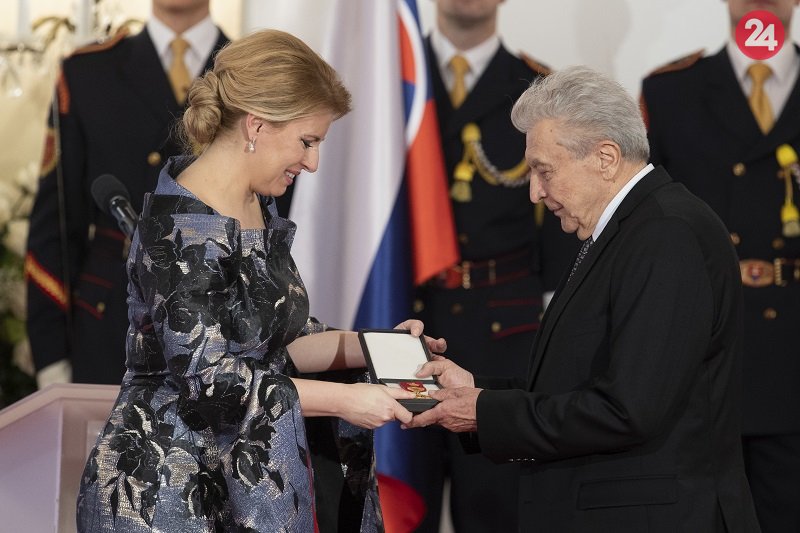 Prezidentka SR Zuzana Čaputová, vpravo Rudolf Urc si preberá vyznamenanie Pribinov kríž I. triedy.