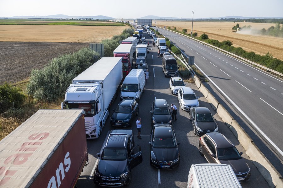 Na snímke pendleri blokujú diaľničný hraničný priechod Čunovo-Rajka smerom do Maďarska v Bratislave v stredu 21. júla 2021.