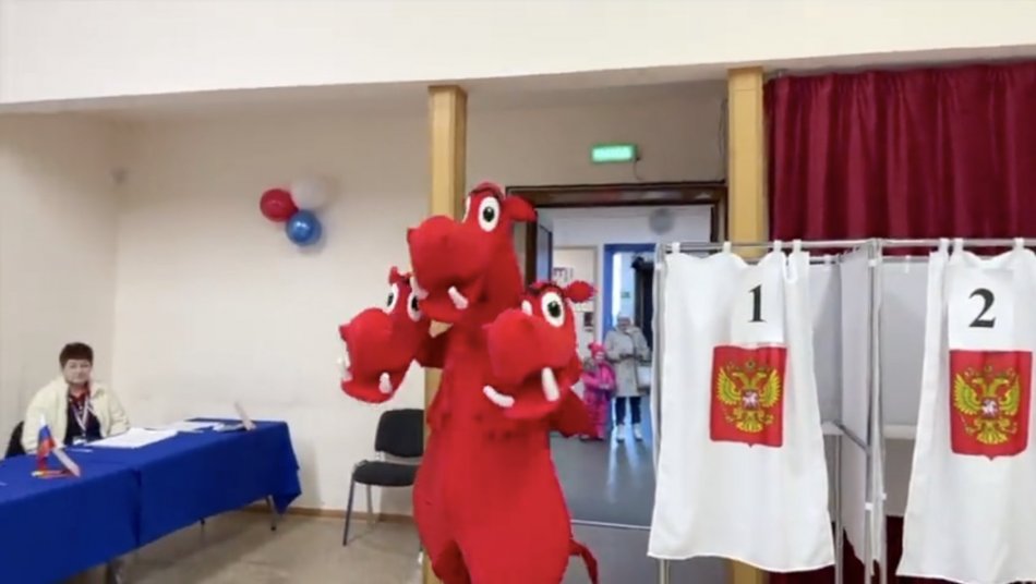 Galéria k článku Kôň a aj trojhlavý DRAK: Rusi chodia k volebným urnám v BIZARNÝCH kostýmoch, FOTO