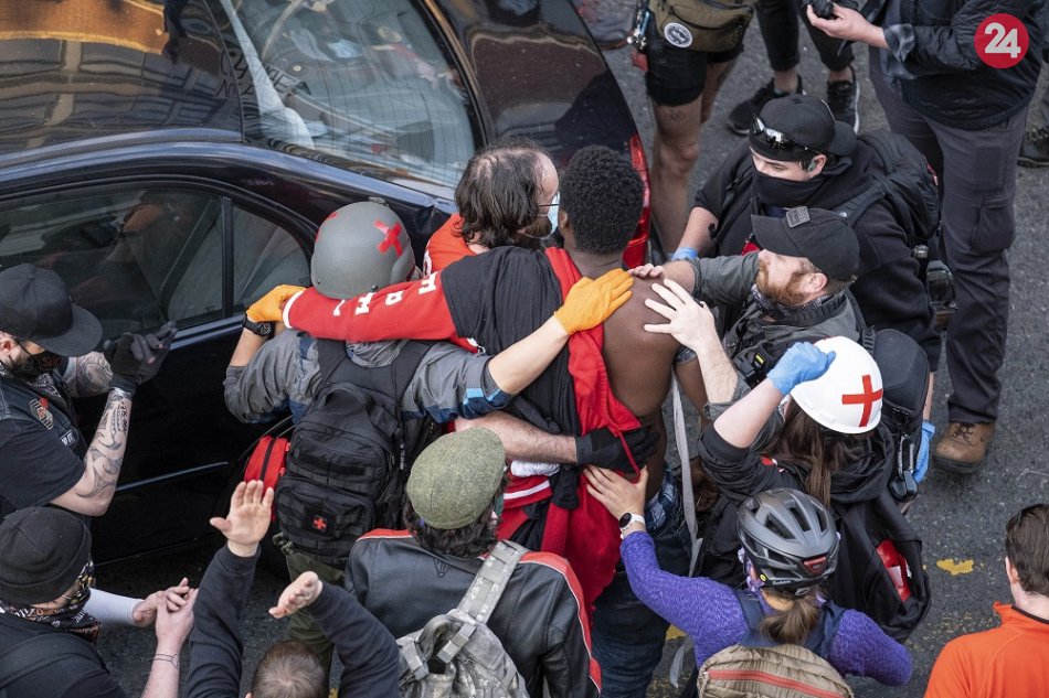 Ľudia pomáhajú zranenému mužovi, ktorý sa snažil zastaviť muža po tom, ako tam medzi účastníkov demonštrácie vošiel s autom a ozbrojený strelnou zbraňou v Seattli.