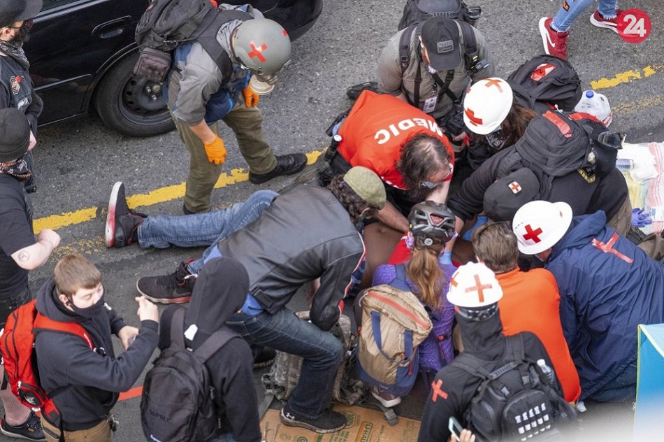 Zdravotníci pomáhajú zranenému mužovi, ktorý sa snažil zastaviť muža po tom, ako tam medzi účastníkov demonštrácie vošiel s autom a ozbrojený strelnou zbraňou v Seattli.