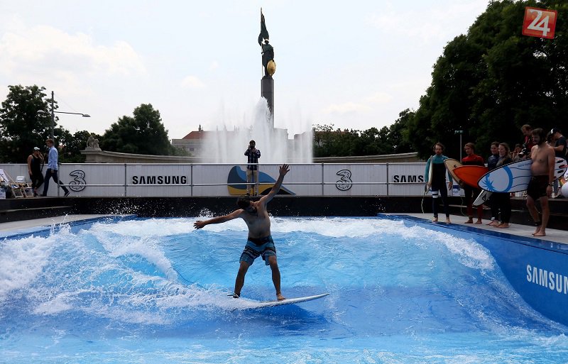 Galéria k článku KURIOZITA DŇA: Zasurfujte si uprostred Viedne. Námestím sa valia morské vlny