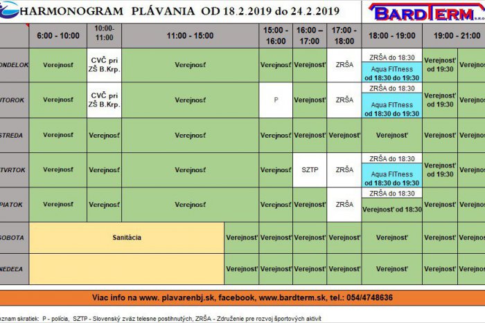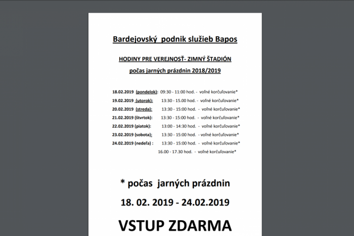 Mesto Bardejov ponúka počas tohtoročných prázdnin bohatý program pre všetky deti. Pre tie do 15 rokov, ktoré radi plávajú, je možnosť si zadarmo zašantiť na mestskej plavárni v čase hodín pre verejnosť. Zadarmo je možné si každý deň aj zakorčuľovať na zimnom štadióne najmä v čase od 13:30 do 15:00.