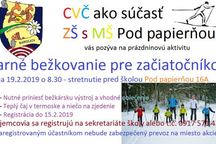 CVČ ako súčasť ZŠ s MŠ Pod papierňou v spolupráci s OZ KMG Delta Laser Bardejov organizuje v dňoch 18.2 – 21.2.2019 od 8:00 do 15:30 hod. pre deti Zdravotnú gymnastiku a tanec. Zdravotná gymnastika sa organizuje v telocvični ZŠ s MŠ Pod papierňou. Po dozorom pedagógov pre deti budú pripravené zaujímavé aktivity a športové tréningové cvičenia určené na precvičovanie správneho držania tela a ohybnosti. Zároveň sa deti oboznámia s modernou gymnastikou – moderným a populárnym športom. Zabežkovať v krásnej prírode si budú môcť deti 19.2.2019. Stretnutie je o 8:30 ZŠ s MŠ Pod papierňou.