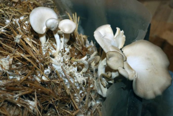 Nekúpili ich však v obchode, ale po prvý raz si ich sami dopestovali vo svojom rodinnom dome. Na snímke Erika Bolfíková pri zbere dopestovanej hlivy ustricovitej v obci Malinová v utorok 7. februára 2017.