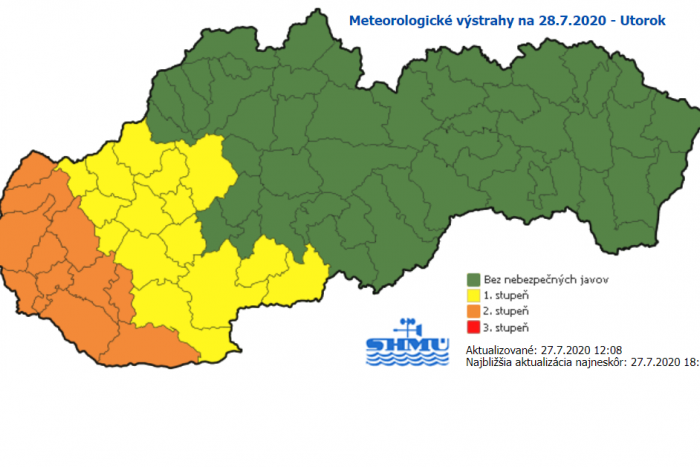 Výstraha druhého stupňa (oranžová farba na mape nižšie) pred horúčavami platí v utorok od 13.00 do 18.00 h pre celý Bratislavský a Trnavský kraj. Tiež väčšinu Nitrianskeho kraja. Tam treba počítať s horúčavami 35 až 36 °C.