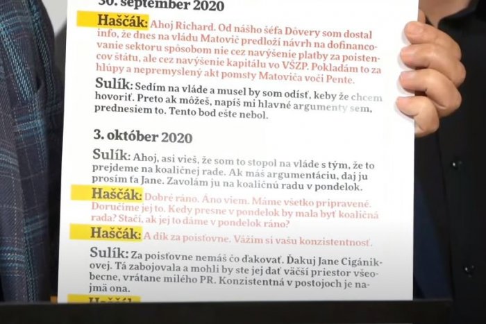 Igor Matovič vytiahol na tlačovej konferencii údajný prepis komunikácie Richarda Sulíka s Jaroslavom Haščákom.
