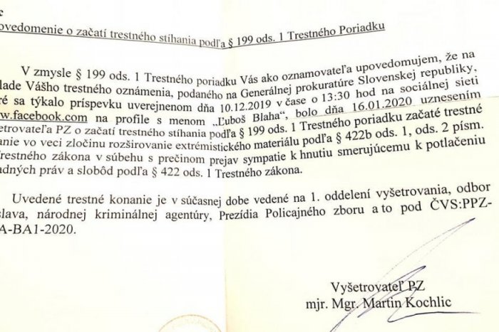 Vyšetrovateľ Národnej kriminálnej agentúry (NAKA) začal trestné stíhanie pre extrémistické trestné činy v súvislosti so statusom poslanca Národnej rady (NR) SR Ľuboša Blahu (Smer-SD).