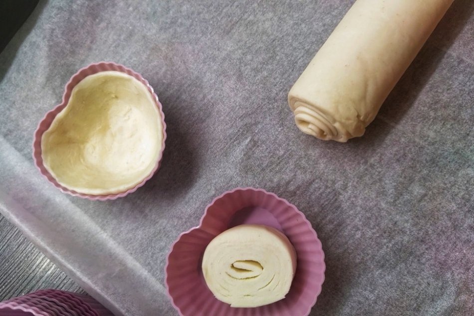2. Lístkové cesto (275-gramové balenie) rozbalíme a zavinieme bez papiera na pečenie späť do „hadíka“. Nakrájame na cca centimetrové slimáky a vystelieme nimi formičky na muffiny.