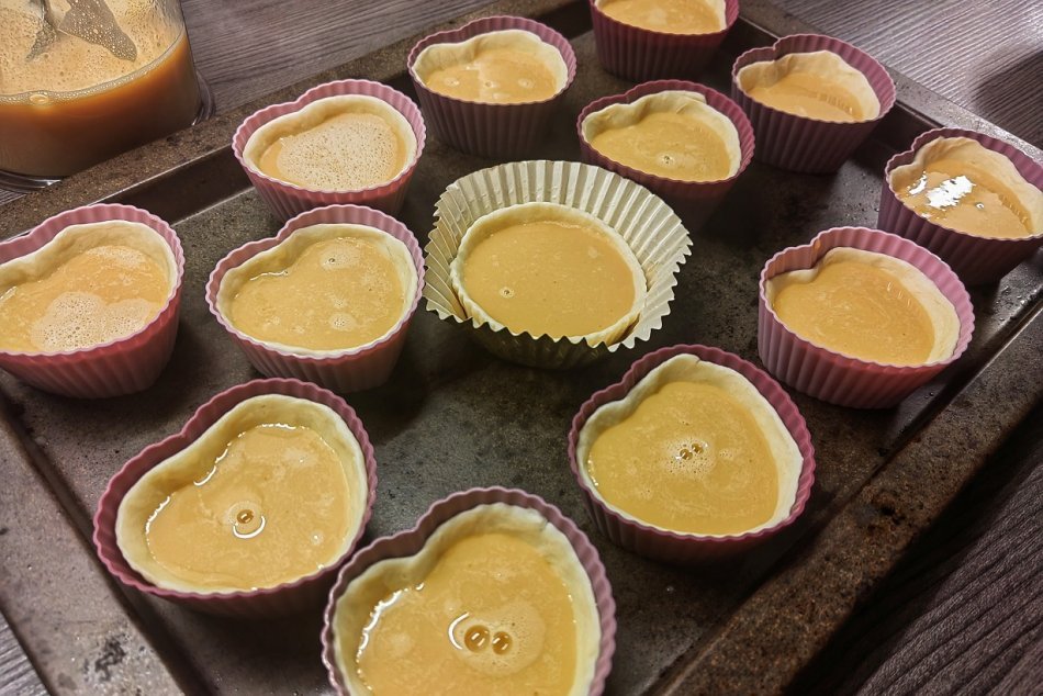 3. Kým ste vystielali formičky cestom, krém krásne vychladol. Vychladnutý krém teraz rovnomerne nalejte do formičiek s cestom. Nezľaknite sa, ak je pudingový krém riedky. Dôležité je, aby bol hladký a bez hrudiek.