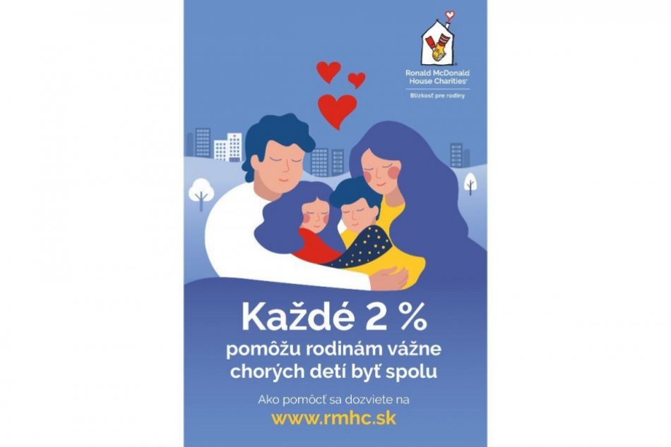 Nezisková organizácia Ronald McDonald House Charities (RHMC) už od roku 2003 rekonštruuje detské oddelenia slovenských nemocníc a prináša potrebnú blízkosť rodinám v ťažkých životných situáciách. Teraz máte možnosť pomôcť malým pacientom aj vy, a to darovaním 2 % z daní.