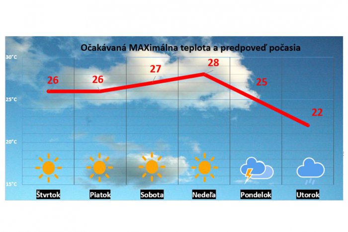 Vrchol by teploty mali dosiahnuť v nedeľu 22. apríla, kedy teplomer môže ukázať až 28 °C. Od nového pracovného týždňa má nastať zmena. Teplota bude klesať a pridajú sa zrážky. „Hneď v pondelok by mal začať počasie ovplyvňovať studený front, ktorý prinesie búrky,“ píše sa na stránke imeteo.sk.