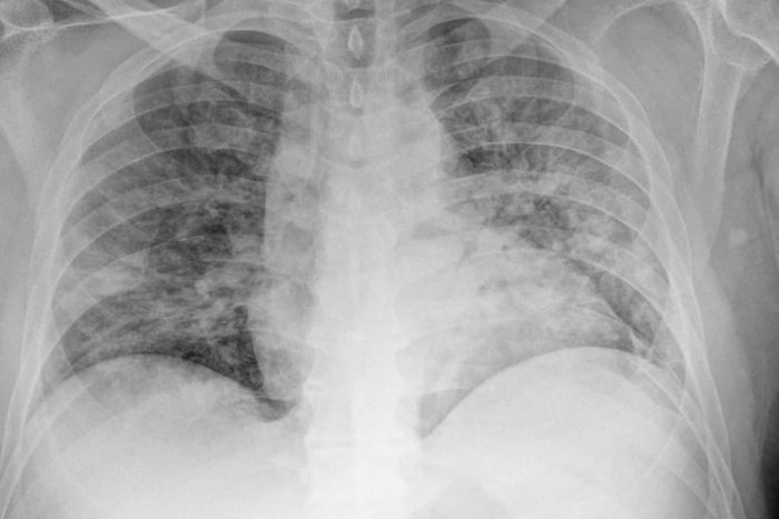 Primár sa vyjadril aj k tomu, koľko pacientov má v sebe vakcíny. „K dnešnému dňu máme na covid oddelení 10 pacientov, z nich 9 neočkovaných. V porovnaní s druhou vlnou sú to mladšie ročníky. Poslední prijatí sú čerství päťdesiatnici s ťažkým obojstranným zápalom pľúc. Okamžite napojení na HFNO (High-flow nasal oxygen), predstupeň umelej pľúcnej ventilácie,“ opísal odborník a dodal aj snímok pľúc pacienta s covidom a neočkovaného.