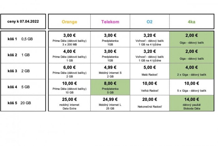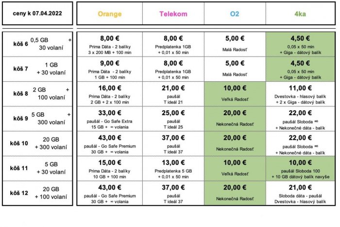 RÚ porovnával najlacnejšie ponuky operátorov za prvý štvrťrok 2022: „Regulačný úrad analyzuje cenové ponuky každého mobilného operátora a vyberá ku každému produktovému košu jeho najlacnejšiu ponuku. Mesačné ponuky regulačný úrad prepočítava na 30 dní, teda ceny produktov, ktoré platia iba 4 týždne (28 dní) sú v tabuľke alikvotne zvýšené o cenu za 2 dni,“ uvádza štátny úrad, ktorý cituje zive.aktuality.sk. RÚ vytvorila 12 balíčkov (priečok), ktoré porovnával medzi operátormi. Výsledok?