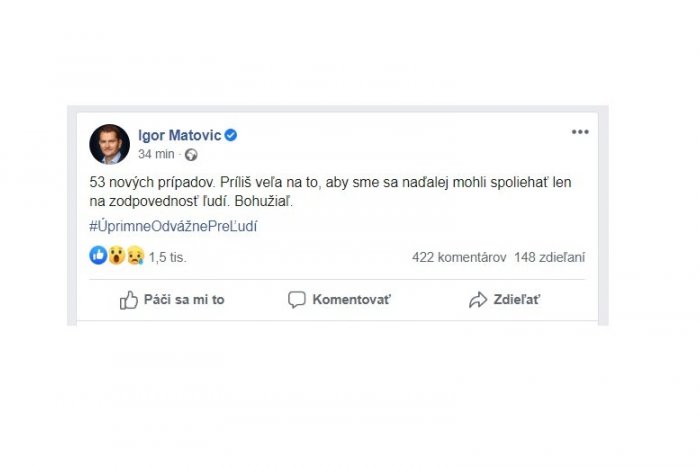 Počas stredy (8. 7.) bolo zistených 53 nových prípadov nákazy novým koronavírusom. Informoval o tom premiér Igor Matovič na sociálnej sieti. „53 nových prípadov. Príliš veľa na to, aby sme sa naďalej mohli spoliehať len na zodpovednosť ľudí. Bohužiaľ,“ napísal, čím naznačil sprísňovanie opatrení.
