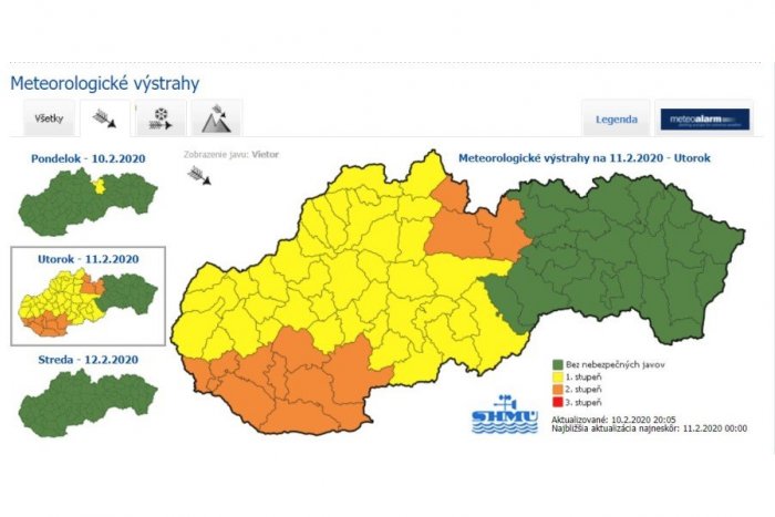 Meteo vyhliadka na utorok 11. februára nie je zďaleka ružová. Slovenský hydrometeorologický ústav (SHMÚ) vyhlásil výstrahy pre väčšinu slovenských okresov, najmä pred silným vetrom.