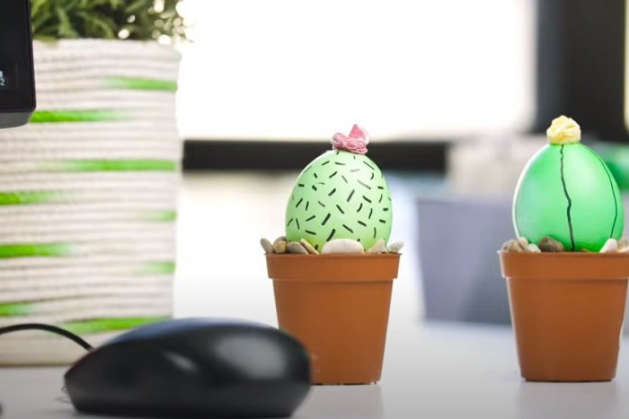 - Chcete vyskúšať niečo originálne? Premeňte vajíčko na kaktus v črepníku. Pripravíme si kvetináč, ktorý naplníme zeminou a kameňmi. Na zafarbenom zelenom vajíčku napodobňujeme štruktúru rastliny fixkou a obrúskom vytvoríme kvet, ktorý prilepíme na vrch „kaktusového vajíčka“.