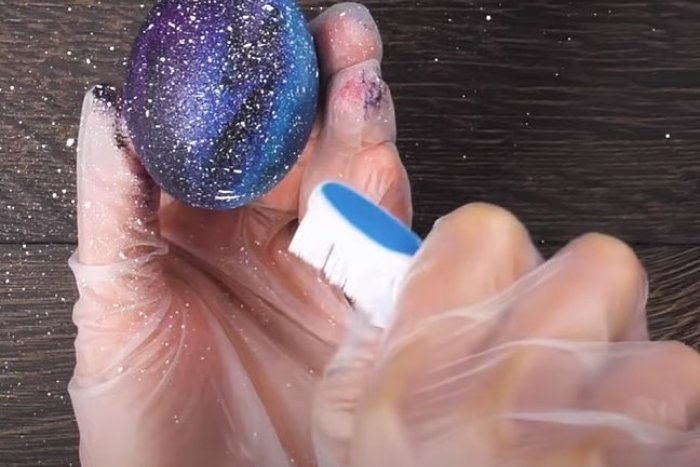 - Vyrobte si vajíčka ako z galaxie! Uvarené vajíčka nafarbíme modrým farbivom. Zoberieme špongiu a vajíčko potom začneme vrstviť farbami. Vznike výtvor ako z iného sveta – na záver pomocou zubnej kefky pofŕkame vajíčko bielou farbou.